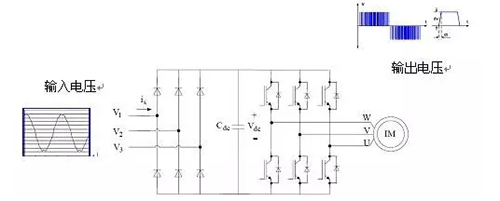 變頻器的基本構(gòu)造如圖2所示,包括整流電路與逆變電路兩部分。整流電路為普通二極管與濾波電容構(gòu)成的直流電壓輸出電路,逆變電路將直流電壓變換成脈寬調(diào)制的電壓波形(PWM電壓)。因此,變頻器驅(qū)動電機的電壓波形是脈寬變化的脈沖波形,而不是正弦波電壓波形。用脈沖電壓驅(qū)動電機就是導(dǎo)致電機容易損壞的根本原因。