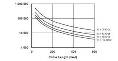 變頻器的載波頻率越高,輸出電流波形越接近正弦波,這會降低電機的運行溫度,從而延長絕緣的壽命。但是,更高的載波頻率意味著每秒鐘產(chǎn)生的尖峰電壓數(shù)量更多,對電機的沖擊的次數(shù)更多。圖4給出了絕緣壽命隨著電纜長度與載波頻率的變化。從圖中可知,對于200英尺長的電纜,當(dāng)載波頻率從3kHz提高到12kHz(變化4倍)時,絕緣的壽命從大約8萬小時降低到2萬小時(相差4倍)。